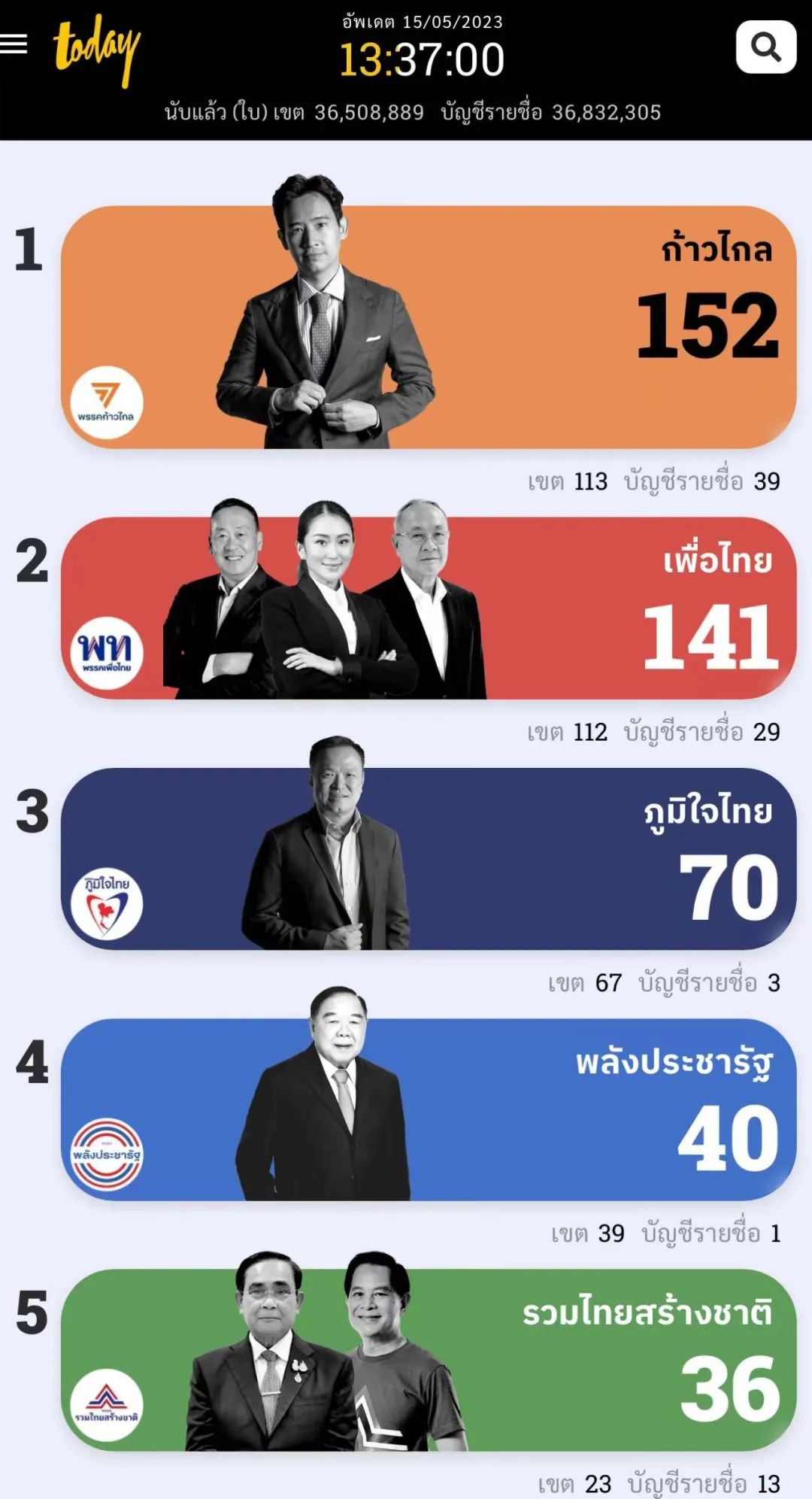 本次泰国大选于5月15日上午落下帷幕,昨夜到今晨的“厮杀”可谓是战况激烈!尤其是为泰党与远进党棋逢对手,统计票数之初,牢牢占据曼谷选区的远进票数一马当先,但中途被为泰党大幅度反超,在许多泰国选民直呼远进已经毫无机会时,这批黑马再次逆转,最终拿下152个席位,超过位列第二的为泰党11席位,总票数上更是远超后者三百余万票。