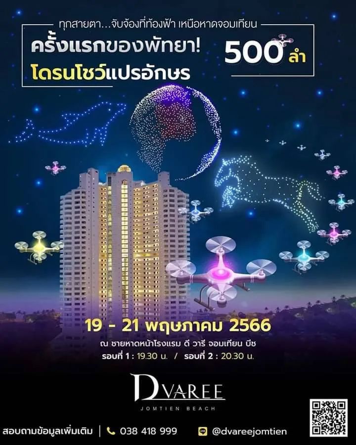 该活动将于 5 月 19 日星期五开始,于下午 6 点至晚上 9 点在 D Varee Jomtien 海滩酒店前举行,届时将有 500 多架可发光的无人机为芭提雅中天海滩增光添彩!