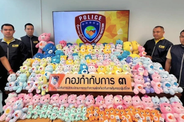 据泰媒报道,警方在曼谷三鹏市场查获了价值近百万泰铢的 1000 多只未经许可出售的假冒爱心熊(care bears),价值超过90万泰铢!