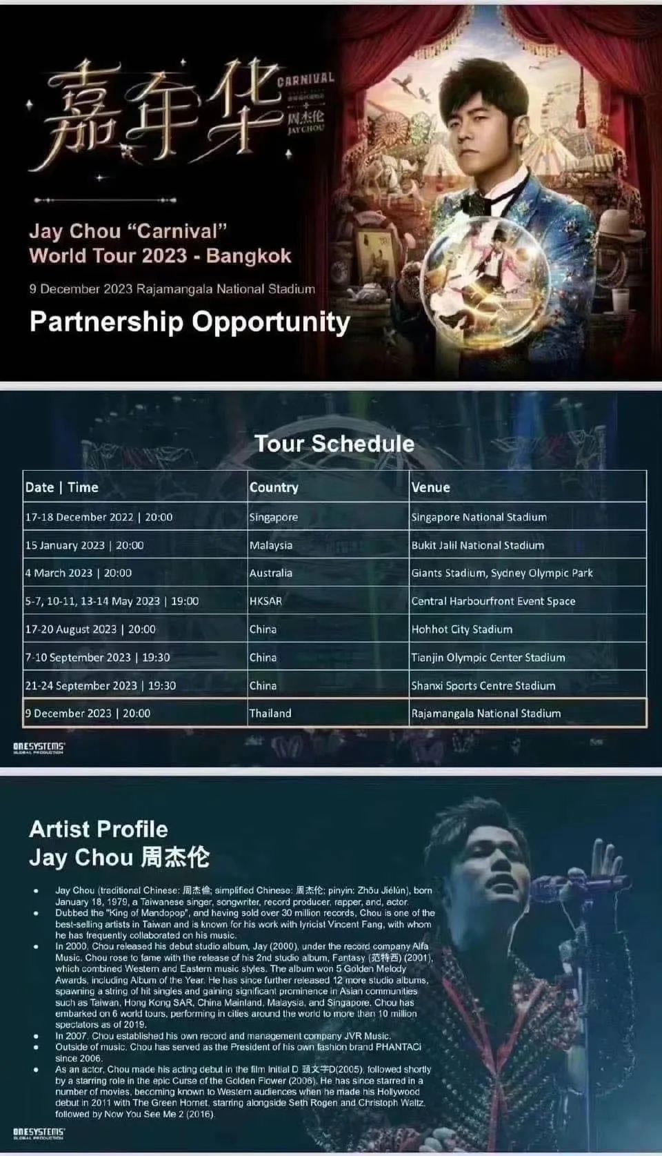 2023周杰伦「嘉年华」世界巡回演唱会新增场次:泰国曼谷站时间:2023年12月9日地点:拉加曼加拉国家体育馆