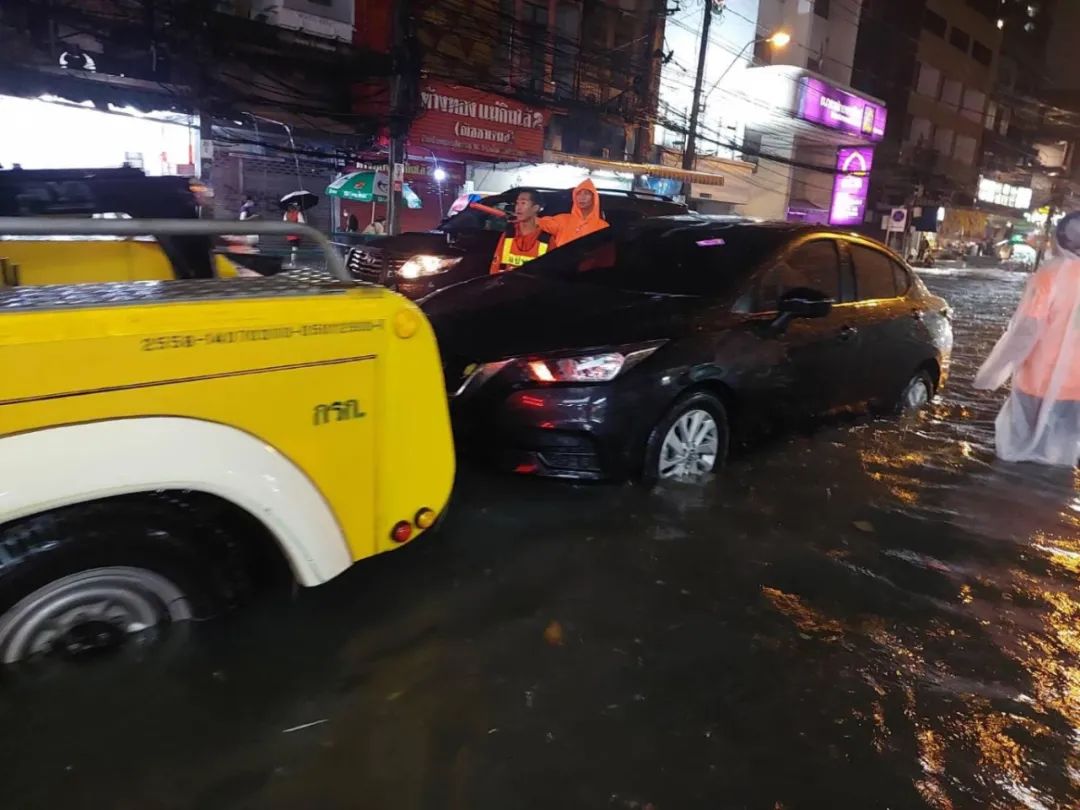 2023 年 9 月 26 日晚,曼谷地区夜间大雨,许多道路出现积水,部分区域被淹,交通堵塞,导致汽车抛锚。