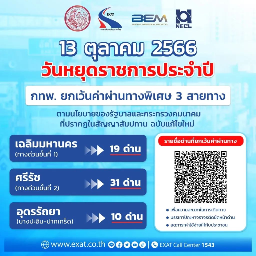 2023年10月13日为泰国九世王纪念日,也是泰国一年一度的公共假期,因此泰国高速公路管理局(EXAT)宣布3条高速公路免收过路费,共计60个检查站。 分别为Chalerm Mahanakorn 高速公路的19个检查站;Si Rat高速公路,共31个检查站;Udon Ratthaya(Bang Pa-in-Pak Kret)高速公路的10个检查站。