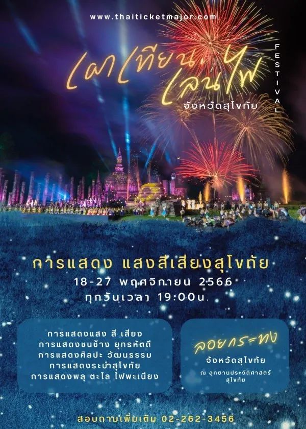 2023年素可泰漂水灯活动将在素可泰府的素可泰历史公园内举行,届时将会有缤纷绚烂的声光秀,由400多名舞蹈演员共同演绎素可泰王国的辉煌历史,同时观众还能看到由Sukhothai Phatthana City Company Limited提供的璀璨烟花秀。