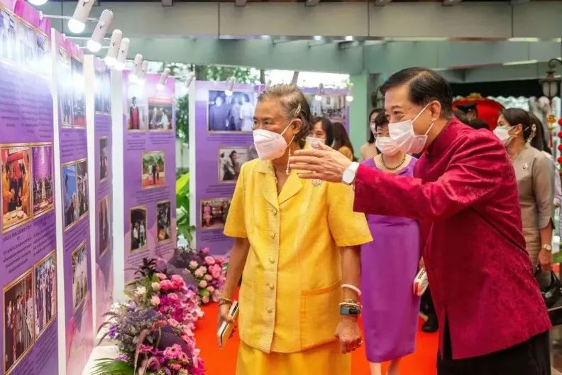 大使官邸门前花团锦簇,张灯结彩,韩志强大使夫妇偕使馆主要外交官列队欢迎诗琳通公主到来。在韩大使引领下,公主首先参观了“泰国王室及诗琳通公主与中国交往”主题图片展,公主驻足良久,深情回忆起自己50多次到访中国的难忘经历和同中国人民的深厚情谊。