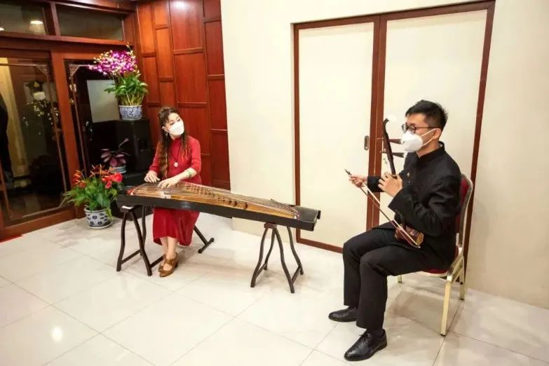 使馆青年外交官和曼谷中国文化中心教师用二胡、古筝演奏《春江花月夜》《彩云追月》《月亮代表我的心》等中国传统乐曲。韩大使邀请公主共同朗诵了中国古代诗人苏轼的名作《水调歌头·明月几时有》。现场欢声笑语,其乐融融。
