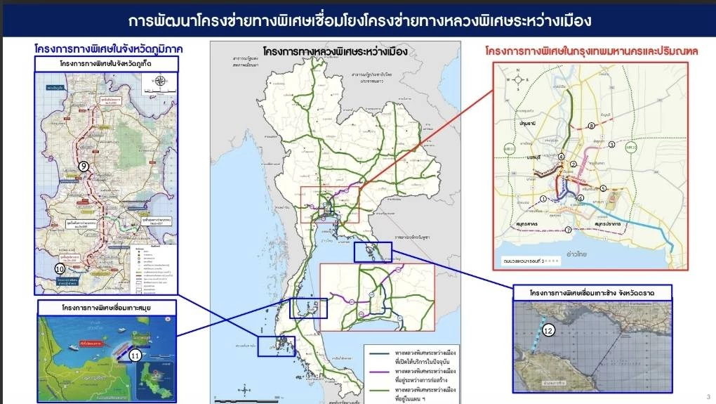 不过,EXAT计划投资开发新的高速公路网络,目前已投入运营,共有12条路线,总投资超过4400亿泰铢,预计从2025年5月起逐步开通服务,包括: