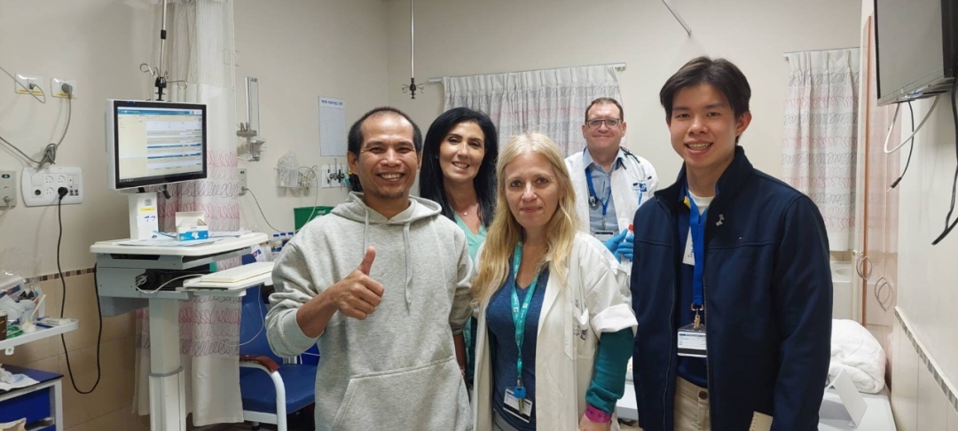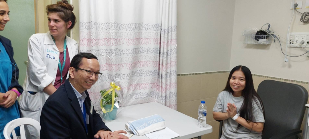 在医院进行健康检查时,TOT工作人员提供了语言翻译协助和基础护理,另外也陆续联系到他们的泰国家属们了。最初让他们在医院住院48小时,以色列医生将提供全程护理,通过安排有6支医疗队,每支医疗队分别由医生、护士、社工和RTA工作人员组成,照顾这10名被释放人质,医院还将安排泰语心理学家相互交谈。目前这10名泰国人作为此次恐怖主义的受害者按照以色列法律都获得福利。泰国政府将采取相关措施,欢迎全部10名泰国兄弟姐妹返回泰国与家人团聚。