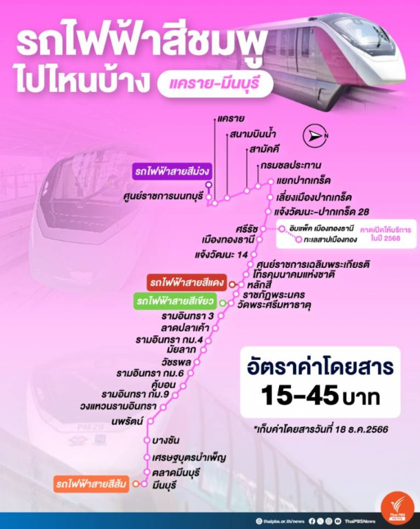 2023年11月21日,是泰国BTS粉线开通首日,粉线BTS从KhaeRai通向民武里,全场共34.5公里,由泰国交通运输管理局(MRTA)和Monorel Bangkok公司承担该项目,共包括30站。