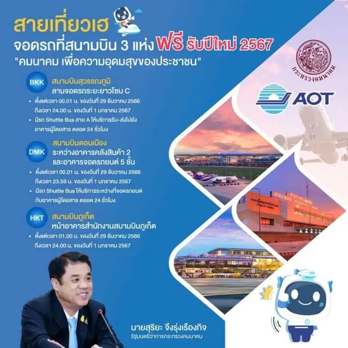 泰国机场公共有限公司(AOT)总裁吉拉迪表示,AOT已经做好了执行素里亚交通部长的政策的准备,AOT将在2024年新年献上一份礼物。素万那普机场、廊曼机场和普吉机场免收停车费如下: