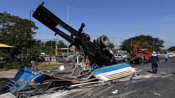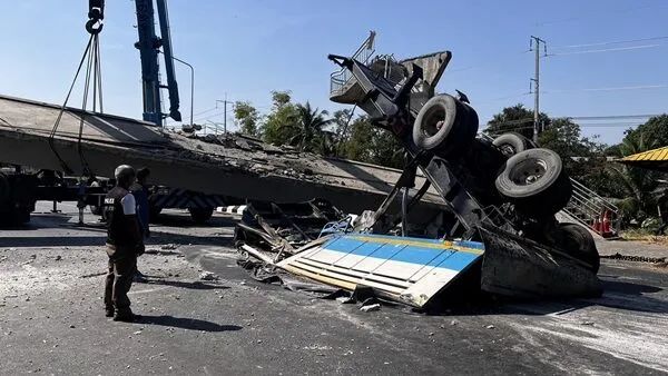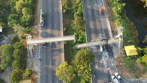 2024年1月7日上午7时左右,泰国红统府市内警察局接到报案,称当地前往北榄府方向的公路上,一辆牵引车撞上天桥,导致天桥倒塌!