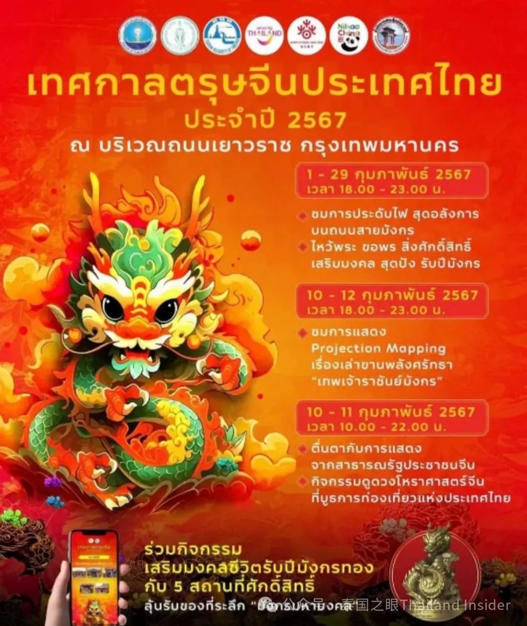 泰国旅游局代表表示,整月唐人街和各个地区都将有春节庆祝活动,活动亮点包括金龙隧道,文化表演,声光秀等,泰国诗琳通公主也会到现场参加住持开幕仪式!