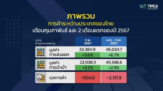 【经济】泰国商务部最新数据显示,2024年2月份泰国出口额为233.849亿美元,实现了连续7个月的增长,增幅达到3.6%;世界经济逐步复苏以及消费信心的回升是推动泰国出口持续增长的主要因素。