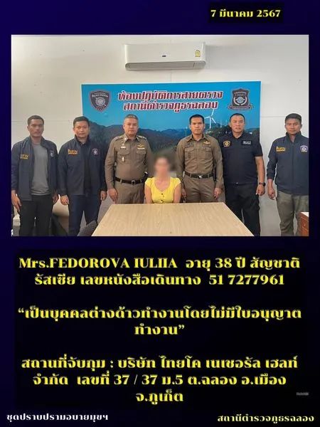 三名俄罗斯人因在Talang 区 tambon Cheong Thalay 经营汽车租赁业务而被捕;一名英国人和三名缅甸妇女因在没有工作许可证的情况下工作而被捕。