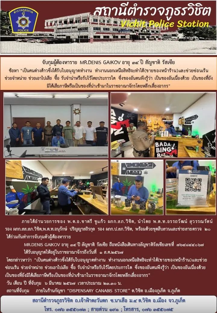 一对俄罗斯夫妇因签证逾期而被捕;一名俄罗斯男子因经营大麻店而被捕,他被指控未经许可工作并从事为泰国人保留的工作。